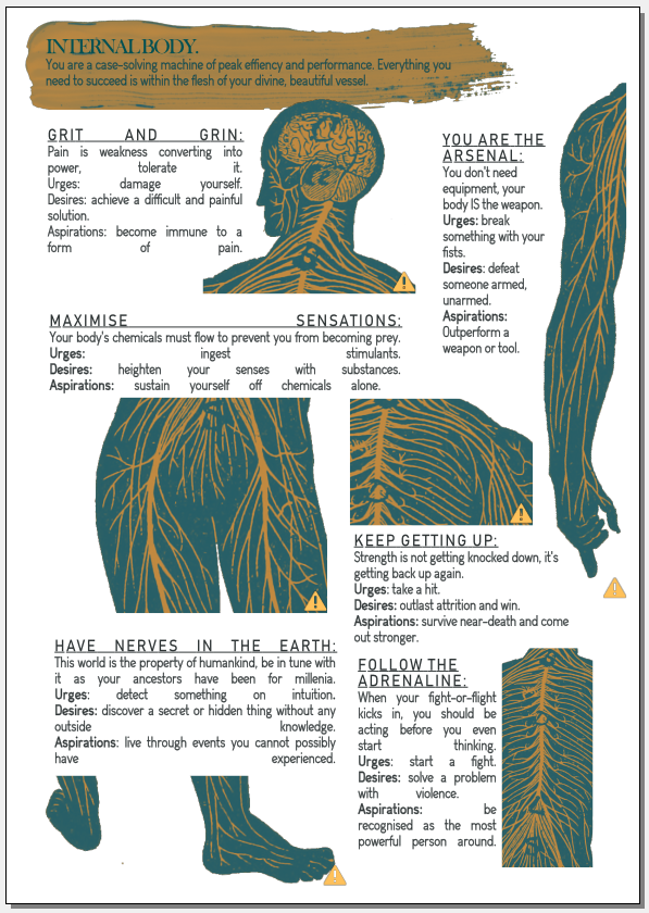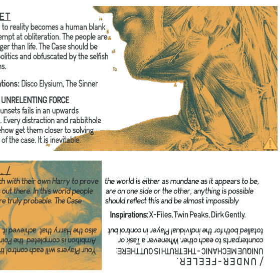 This is a competitive mystery-solving tabletop-roleplaying game for, in theory, up to 24 players (please do not do this). Each player will have control of a 'Disposition' within Harry's mind that leads them toward certain paths of progress depending on their Skills and Obsessions. Whilst that player is in control, they dictate everything Harry attempts to do but if at any point they fail any kind of skill check, control of Harry goes up for Auction.